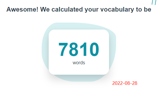 上一次测试词汇量是在 2020 年 5 月 ,当时的词汇量大约是 7420 。今天突然想起来好久没测了,随手测了一下,这次测出的词汇量大约是 7810 ,跟两年前相比基本没有太大的变化。这是符合预期的,这两年我就没有在英语上下过工夫,没有退步就不错了。