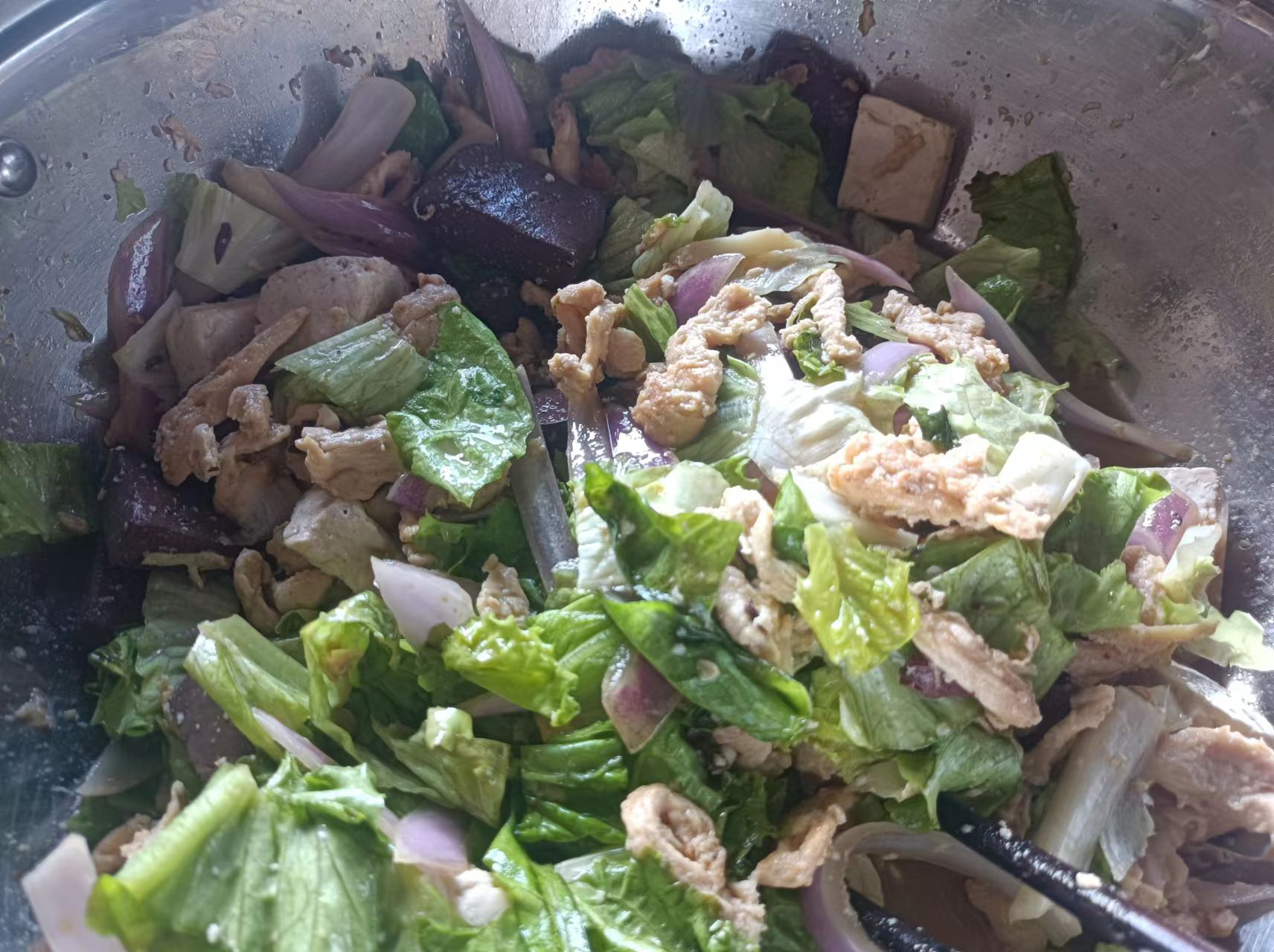 我最近做的一次凉拌菜,食材有鸡胸肉、猪血、豆腐、生菜、洋葱、西红柿等,成本 10 元左右,耗时 30 分钟,可以吃一天。