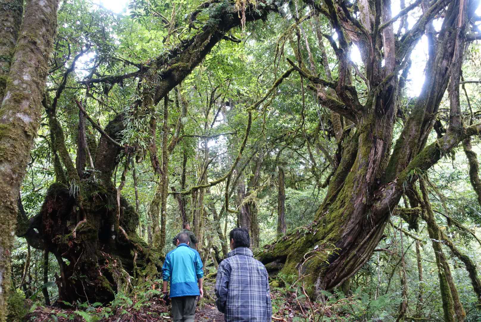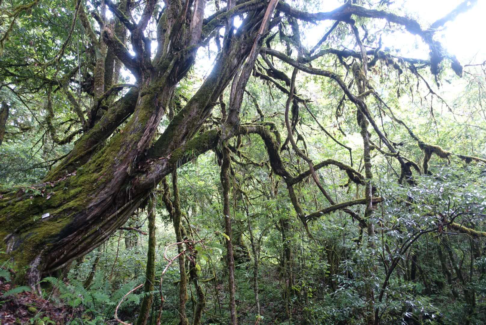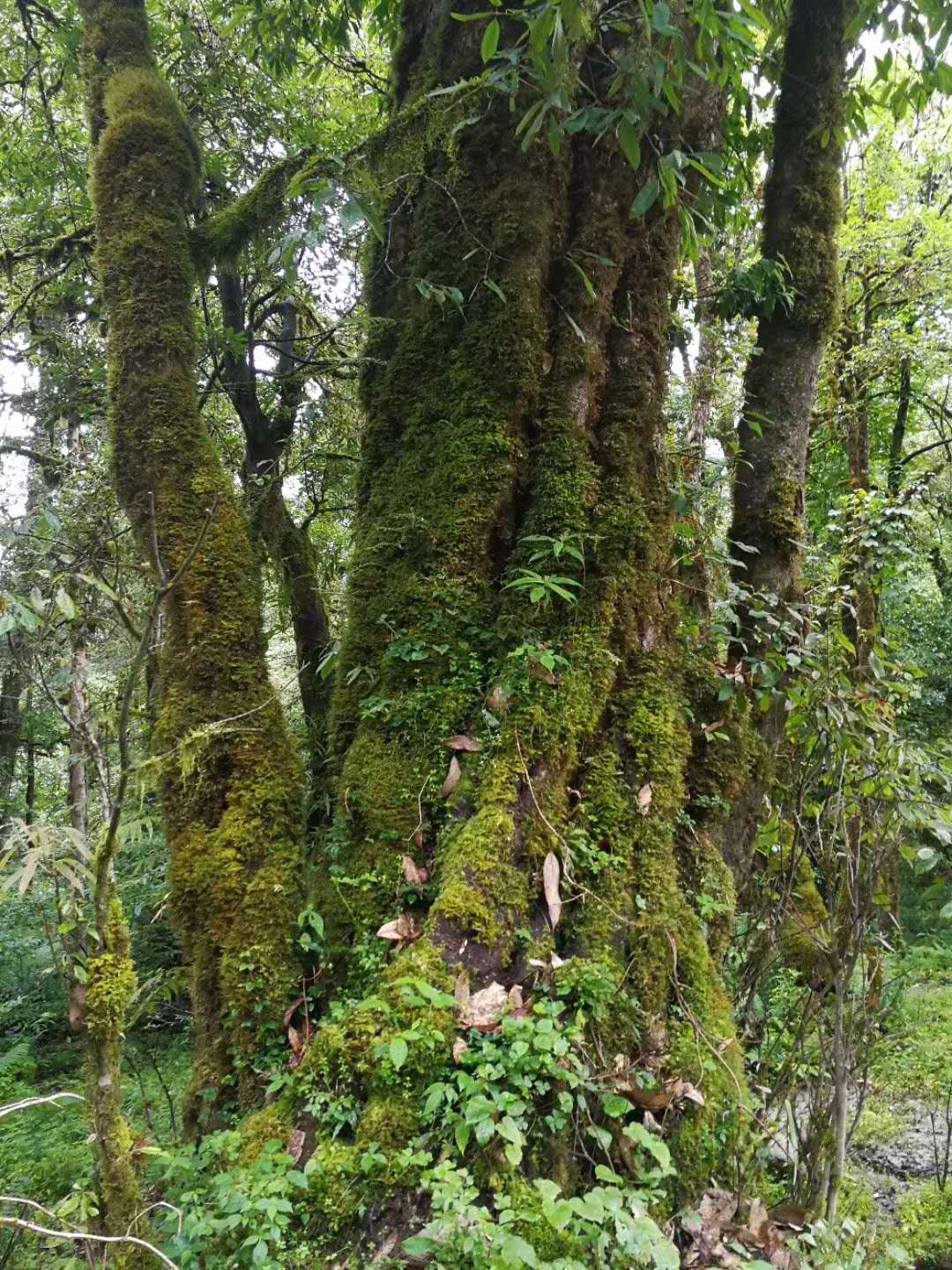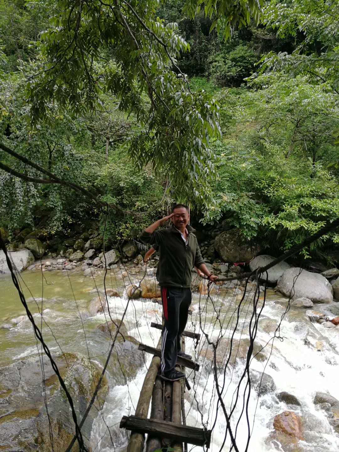 「幸福小食」的主人是一位身材消瘦、头发花白的老伯,他来自大理州(具体地方我记不清了),20多年前就是这个地方的木材工人。木材生意解散后,他还是没有离开,养了几只鸡,种了一些菜,自给自足,盖了几间小木屋,偶尔接待一下游客。此地的生活条件是相当简陋的,网络基本没信号,用电全靠不远处的水力发电机。他向我们介绍了周边环境,第二日一早给我们做向导,带我们进原始森林转了一圈,顺便给我们普及了一些关于树木的知识。