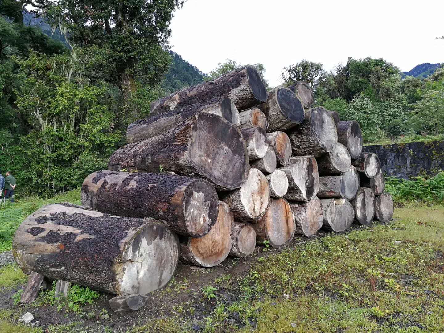 一路开到一个叫「亚坪十八公里」的地方,住着几户人家。这里曾经是木材的集散地,不远处的草地上依然堆着不少粗壮的木头,现在已经不让运出去了。这一片属于保护区,有多种国家级保护树种。继续往前,由于在修路,再加上前两天下雨,路太泥泞,在一个上坡车轮打滑上不去,没能去成 31 号界碑,只能原路返回到「亚坪十八公里」。这里有一家叫「幸福小食」的小店,我们在此留宿了一晚。